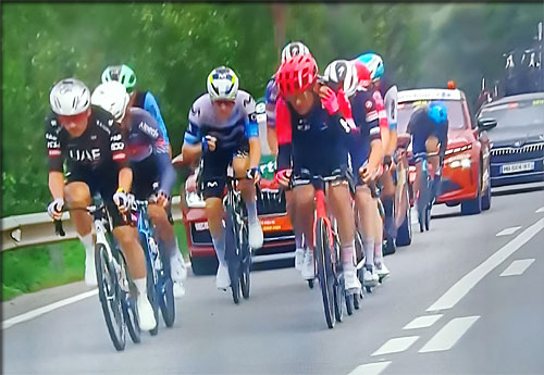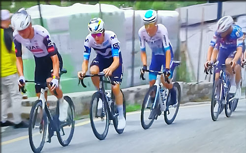 4' 10" . L'écart continue de redescendre vertigineusement. Jay Vine tente de réagir et relance le groupe dans la montée
