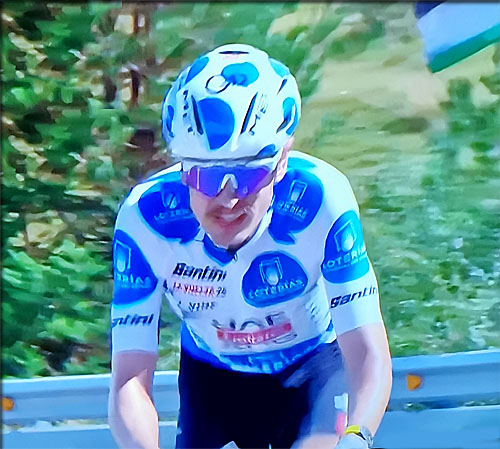 Jay Vine passe en tête le sommet de CREU DE PERVES DESNIVEL 2ème col du jour. Il engrange 5 pts de plus
