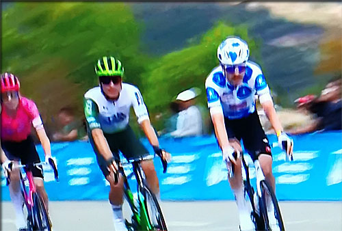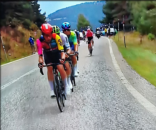 Pedersen a tenu le coup dans les passages raides et c'est lui qui relance en tête de peloton et s'en extrait pour prendre Ayuso en chasse