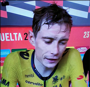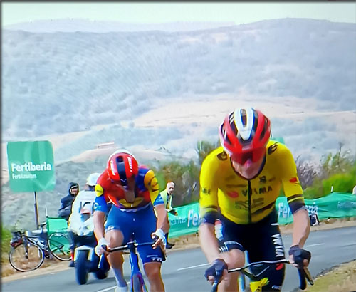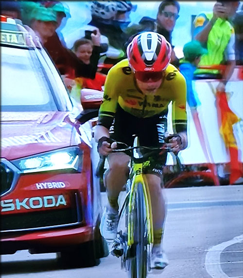 Au passage de la localité de Corera Vingegaard a un problème avec son vélo, il s'arrête mais repart