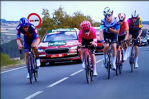 Ecart 2' 22" entre les 5 qui n'ont que peu de chances de l'emporter à Valdescaray et le peloton emmené sans faillir par les Lidl Trek