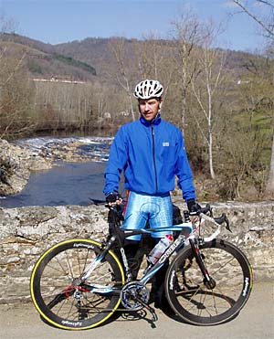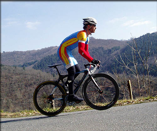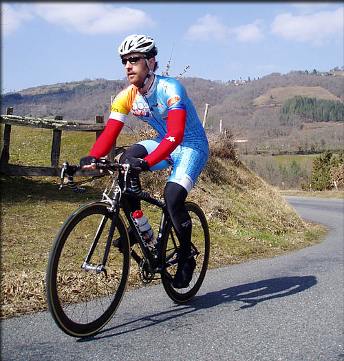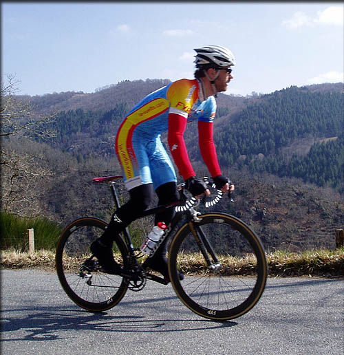 Il roule ici sur le Giant TCR carbone, un peu trop