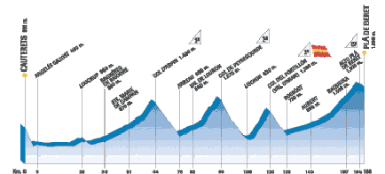 Deuxième grande étape de montagne, en grimpant les cols mythiques du Tour de France : Aspin, Peyresourde et le Portillón pour entrer à nouveau en Espagne par le Val d'Arán et arriver aux cotés des pistes de ski de fond de Pla de Beret après une longue montée de Vielha.