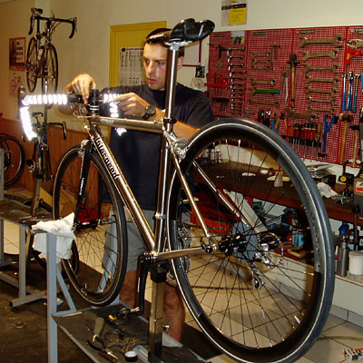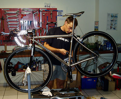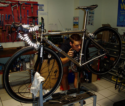 Bruno lors du réglage de la potence Extralite sur le LITESPEED. Les