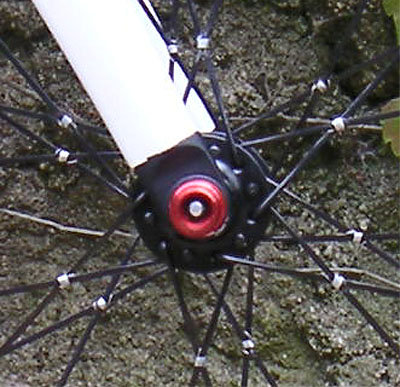 ligatures sur la roue LEW. Ici l'écrou de l'attache rapide Tune et la patte